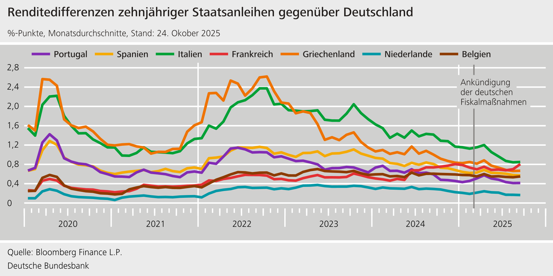 Im Bericht gehen wir auch auf Markrisiken im Zusammenhang mit den eingangs erwähnten hohen staatlichen Schuldenständen in Europa ein. Wir sehen, dass die Renditedifferenzen gegenüber deutschen Staatsanleihen seit Ende der Coronazeit deutlich gesunken sind (Abbildung). Günstige Wachstumserwartungen dürften dazu beigetragen haben. Wenn sich diese aber nicht erfüllen und die Kurse von Anleihen dann plötzlich fallen, könnten Banken erhebliche Verluste erleiden.
