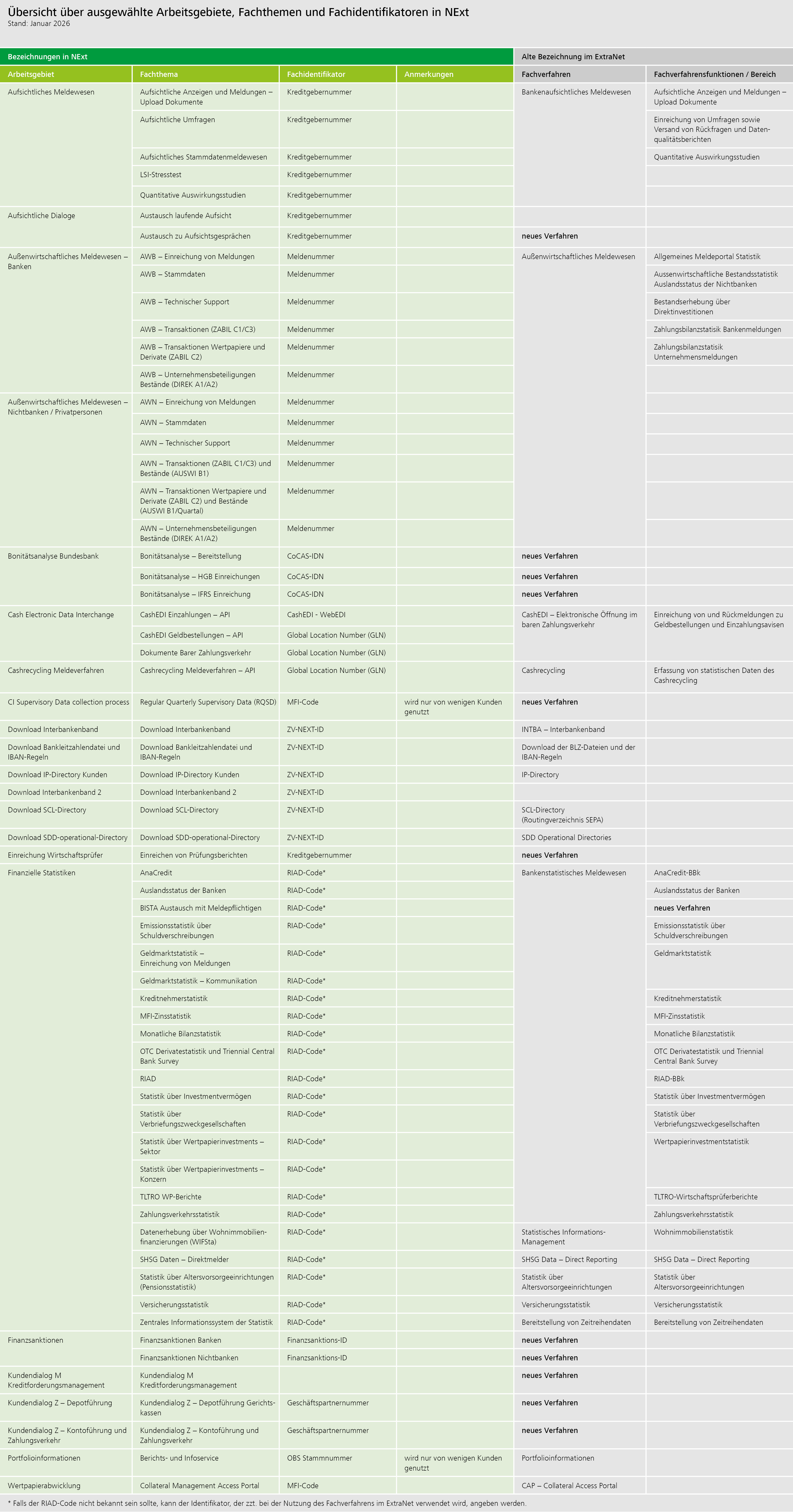 In der nachfolgenden Übersicht werden grundsätzlich alle zukünftigen Fachverfahren und Fachverfahrensfunktionen aus dem ExtraNet den neuen Arbeitsgebieten und Fachthemen in NExt gegenübergestellt. Die Verfügbarkeit in NExt wird proaktiv angekündigt.